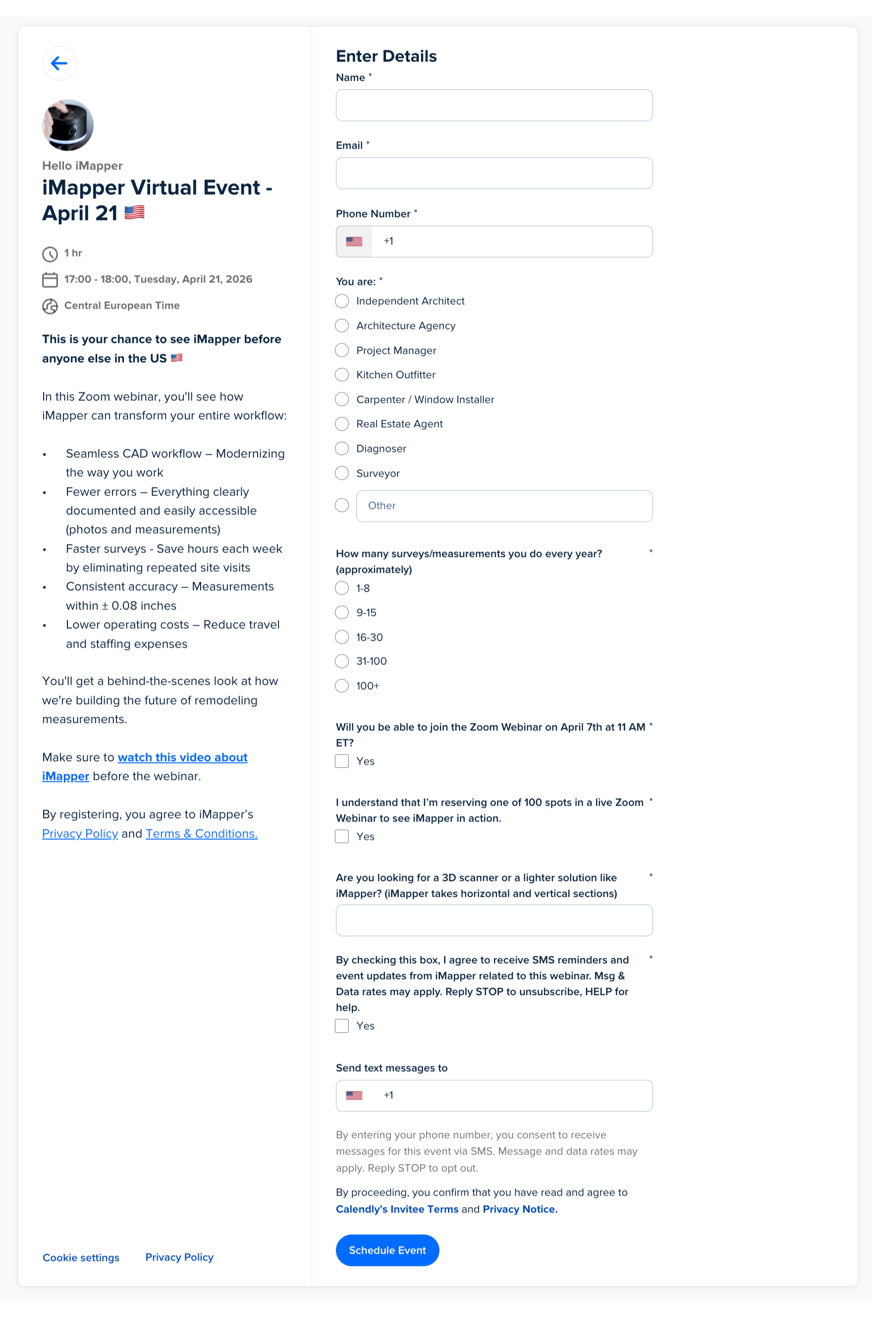 Users register for iMapper webinars via a dedicated event page hosted on Calendly, accessible from iMapper's website at imapper.tech. During the registration process, users are required to complete a form that includes an explicit, mandatory SMS consent checkbox. No SMS messages are sent to users who do not check this box.