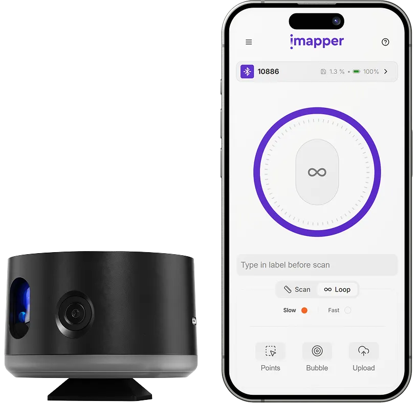 Millimeter accuracy with an average of over 1200 point clouds per minute and ten photos at 360 degrees. One click of the start button is all it takes to measure a room. Best of all, you can chat with your client while iMapper is working for you.